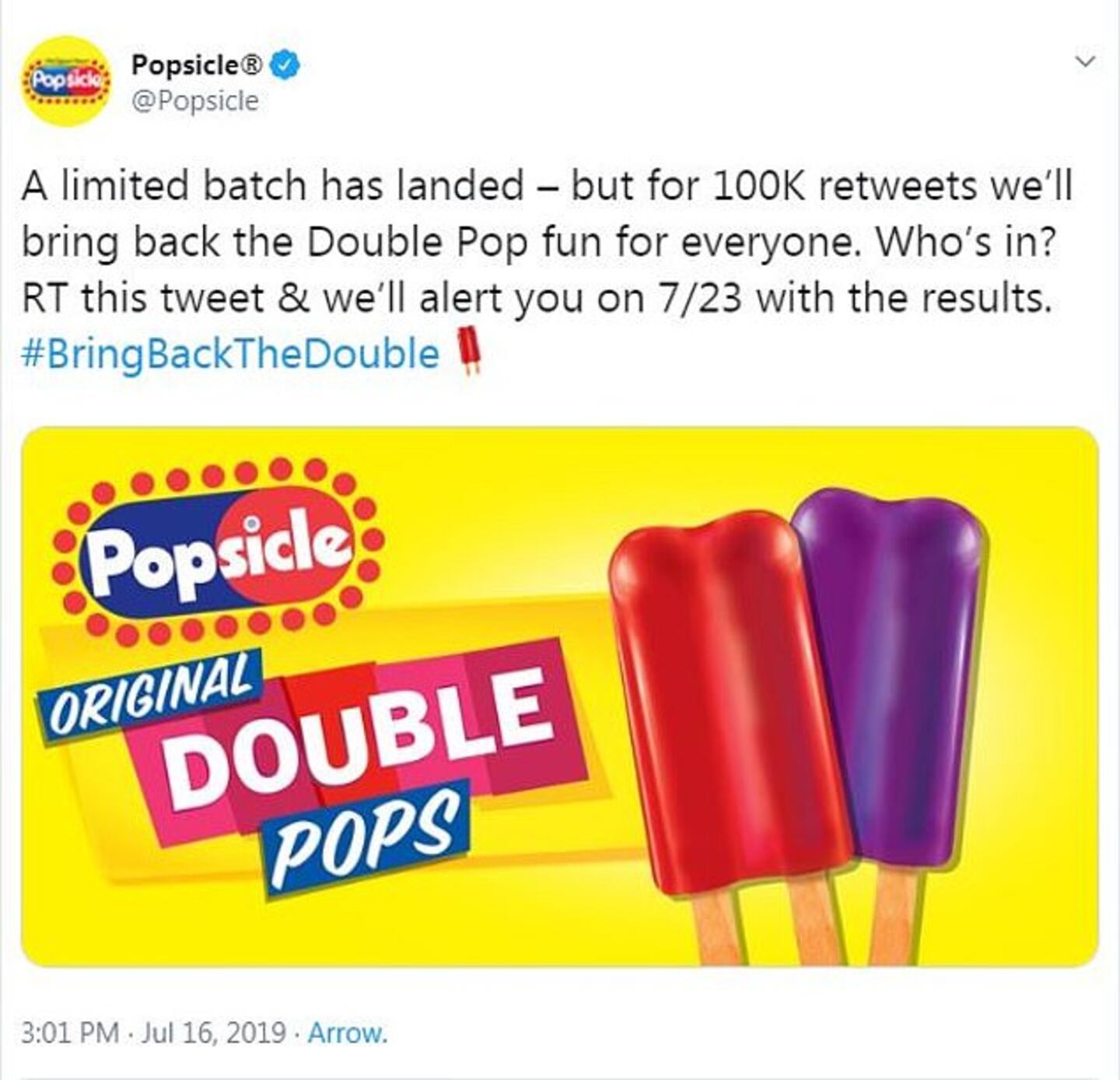 Popsicle responded with a challenge. 100,000 retweets and they would bring back the double stick.