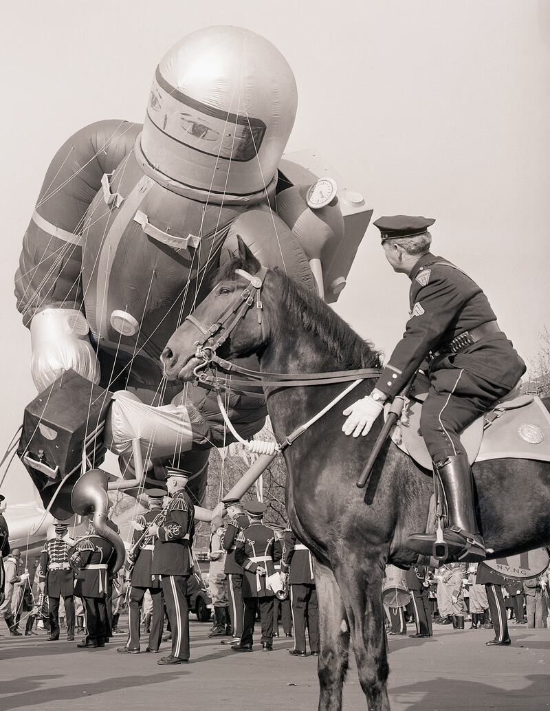 Police Officer Steadies Horse at Parade (Original Caption) 11/27/1952-New York, New York- Sergeant Frank Ford of New York City's Mounted Police steadies his horse as the mommoth "Space Cadet" in Macy's Thanksgiving Day parade leans threatenly at the start of the march. No mishaps were reported and no children were frightened as the parade made its way down Central Park West from 77th street, with huge colorful floats and entertainment luminaries in abundance. (Bettmann/Bettmann Archive)
