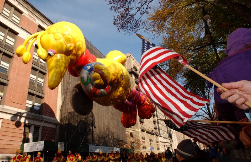 76th Annual Macy's Thanksgiving Day Parade NEW YORK - NOVEMBER 28: Sesame Street's Big Bird and friends perform at the 76th Annual Macy's Thanksgiving Day Parade in Herald Square November 28, 2002 in New York City. (Photo by Matthew Peyton/Getty Images) (Matthew Peyton/Getty Images)