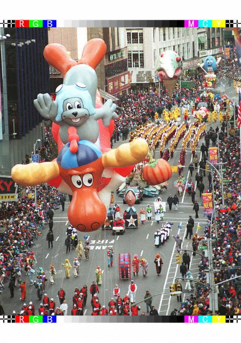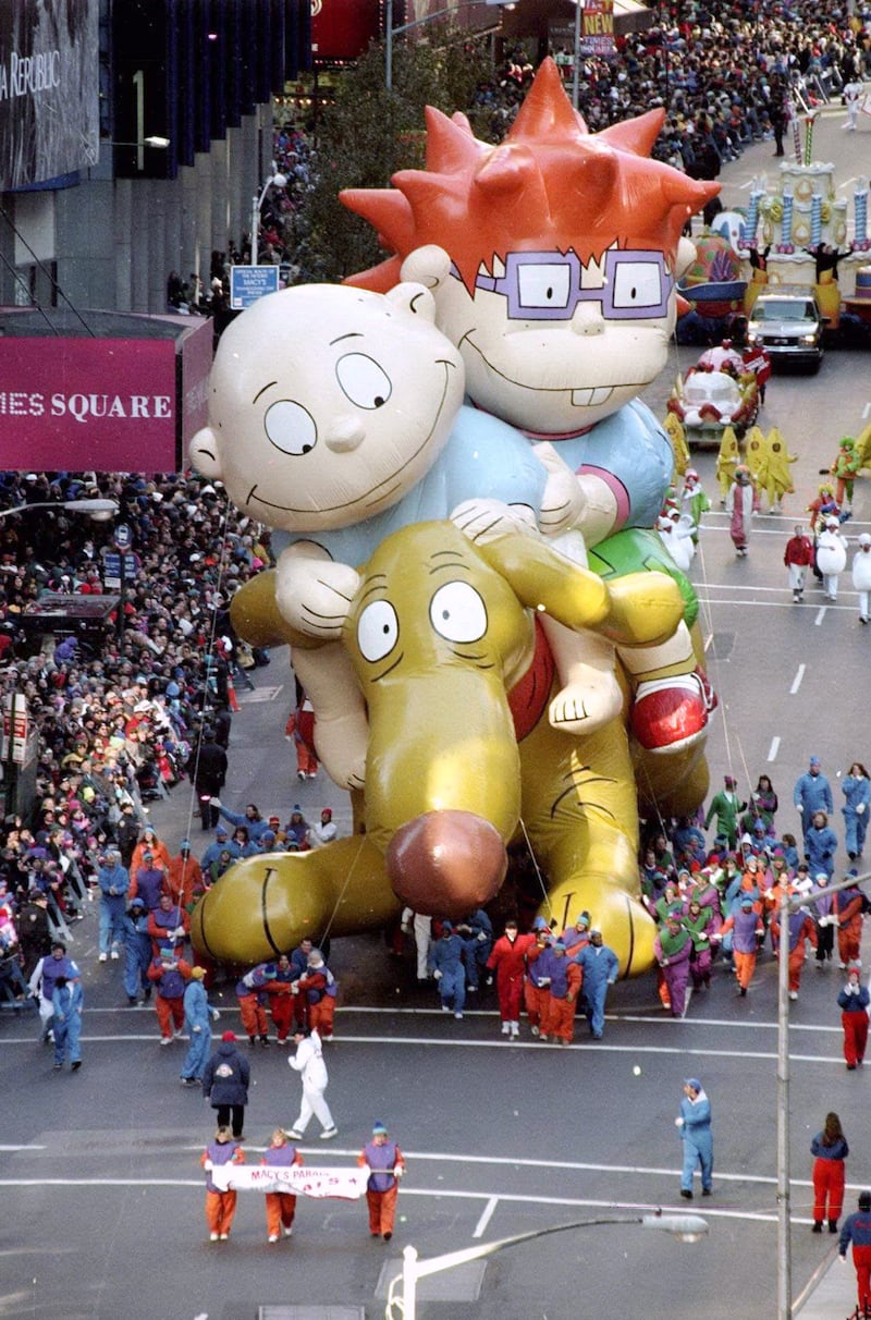 The Rugrats and Spike balloons float through Times Square du UNITED STATES - NOVEMBER 27: The Rugrats and Spike balloons float through Times Square during the annual Macy's Thanksgiving Day Parade in New York City. An estimated one million spectators lined the parade route from Manhattan's upper West Side to the Macy's store at Herald Square in midtown. (Photo by Evy Mages/NY Daily News Archive via Getty Images) (New York Daily News Archive/NY Daily News via Getty Images)