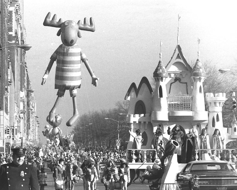 US MACY'S PARADE 1 The balloon of the cartoon characters Rocket J. Squirrel (Rocky) and Bullwinkle the moose floats down Broadway in New York followed by marching bands and other balloons during the Macy's Thanksgiving Day Parade 28 November. This is the 70th anniversary of the annual event.