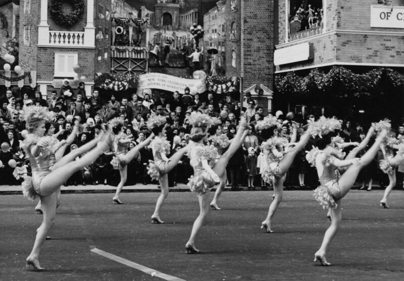 Macy's Day Parade High-kicking young ladies during the Macy's Day Parade at Thanksgiving in New York City, 26th November 1961. A number of tableaux behind commemorate landmarks in the city's history. (Photo by Archive Photos/Getty Images) (Archive Photos/Getty Images)