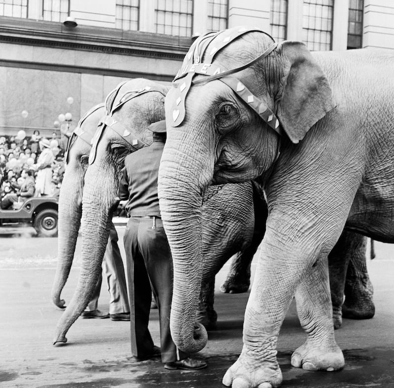 Macy's Thanksgiving Day Parade MACY'S THANKSGIVING DAY PARADE -- Pictured: A group of elephants pass by during the 1954 Macy's Thanksgiving Day Parade (Photo by NBCU Photo Bank/NBCUniversal via Getty Images via Getty Images) (NBC/NBCUniversal via Getty Images)