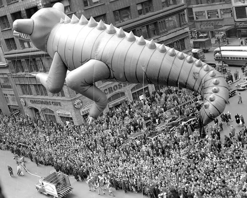 Huge helium-filled alligator is hauled through Times Square UNITED STATES - NOVEMBER 24: Huge helium-filled alligator is hauled through Times Square during Macy's Thanksgiving Day parade, an annual affair. The parade drew an estimated 2,000,000 spectators, including a host of notables. (Photo by NY Daily News Archive via Getty Images) (New York Daily News Archive/NY Daily News via Getty Images)