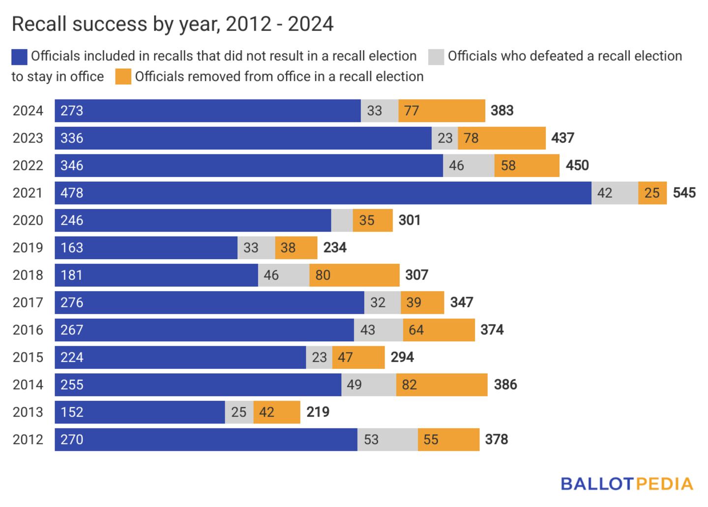 Ballotpedia covered 246 recall efforts against 383 officials in 2024. Efforts against 77 officials were successful, removing them from office via a recall election. Sixteen officials resigned after recall efforts were started against them, 33 were put on the ballot but defeated the recall to stay in office, and the recall efforts against 201 officials failed to make the ballot. Recall elections for another eight officials were scheduled but were not held in 2024, and 53 officials faced recall efforts that remained underway into 2025.