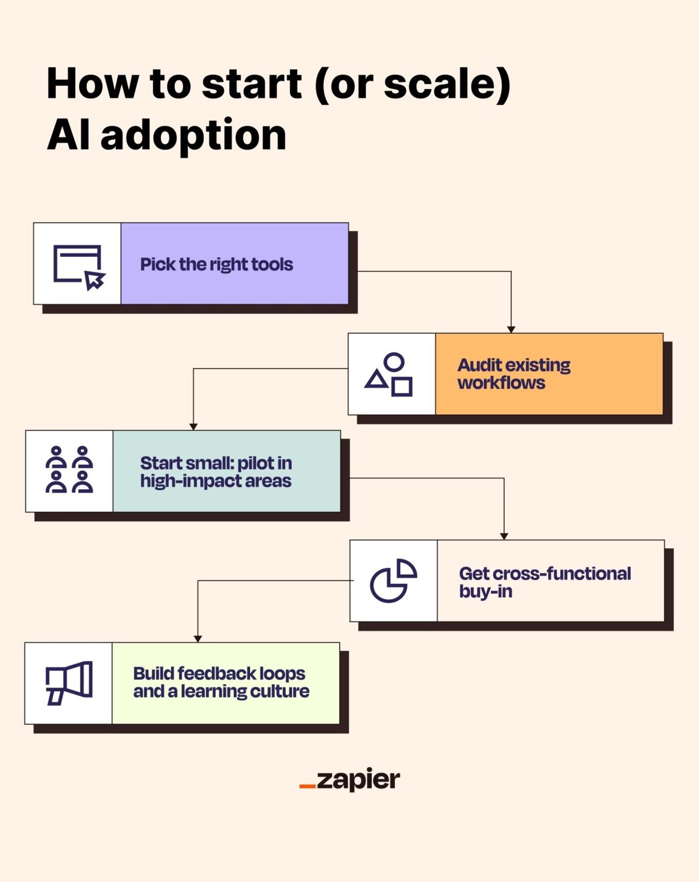 That's the paradox. AI is both helpful and hard, useful and overwhelming. This guide by Zapier can help you walk that line: how to adopt AI in a way that's thoughtful, strategic, and maybe even fun—without losing your mind (or your team's trust) along the way.