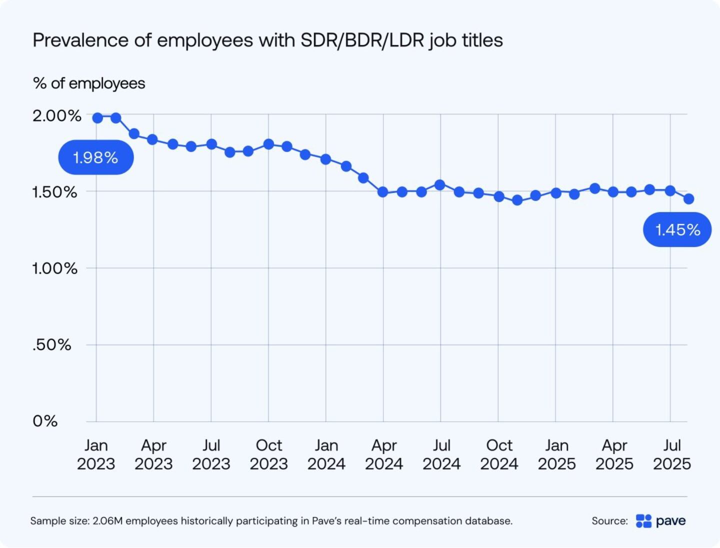 Historically, SDR roles served as a gateway for new college graduates into lucrative sales positions. If you proved yourself as an SDR by making thousands of cold calls and learning the basics of selling, you could advance. However, when Pave examined the prevalence of employees with SDR-related job titles, the data shows these jobs are steadily disappearing.