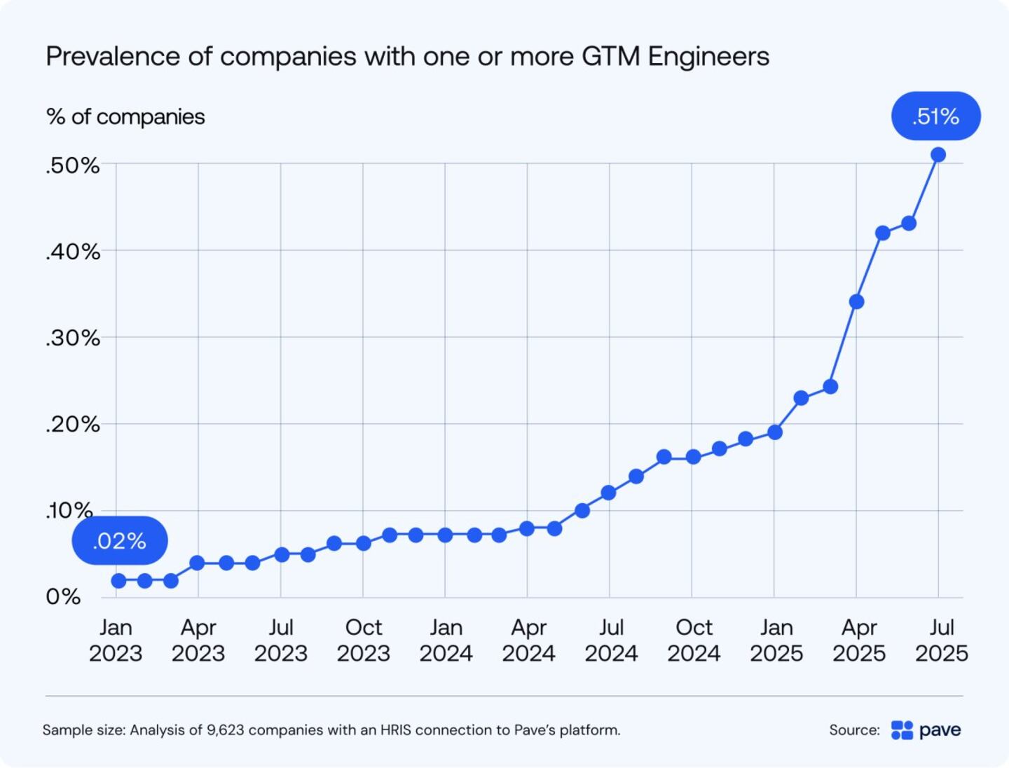 The rate of growth for Go-To-Market (GTM) Engineers is even faster. This so-called “hot job” is taking off as companies work to incorporate AI applications into their sales and marketing technology ecosystems. Again, among all companies connected to Pave’s database, the prevalence of companies with at least one GTM Engineer grew from 0.02% in January 2023 to 0.51% in July 2025, with a clear spike occurring at the start of this year.