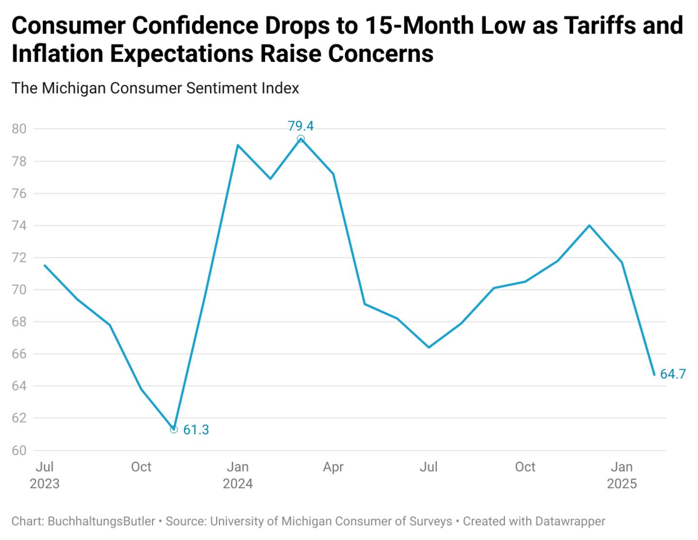 Americans are growing increasingly uneasy about the state of the economy. Consumer sentiment has fallen to a 15-month low in February as inflation expectations spike and concerns over tariffs mount, according to the University of Michigan's latest Consumer Sentiment Index. BuchhaltungsButler and DataPulse Research say this decline spans across all age and income groups—and even Republicans' post-election confidence has dipped.