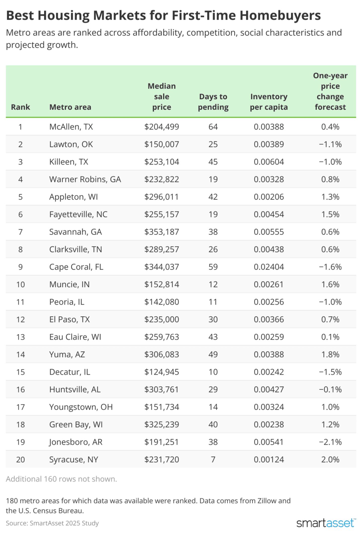 - McAllen, TX is the best metro area for first-time homebuyers in 2025. After ranking fourth last year, McAllen has replaced Lawton, OK as the number one metro area for hopeful homeowners. In particular, it offers positive projected home-price growth over the next year, moderate affordability with the median sale price of $204,499 being about four times as much as the median local income, and a market that allows potential buyers to take their time to make a decision before putting in an offer.