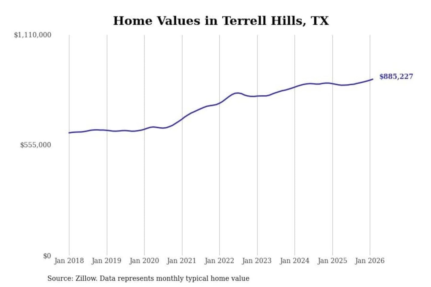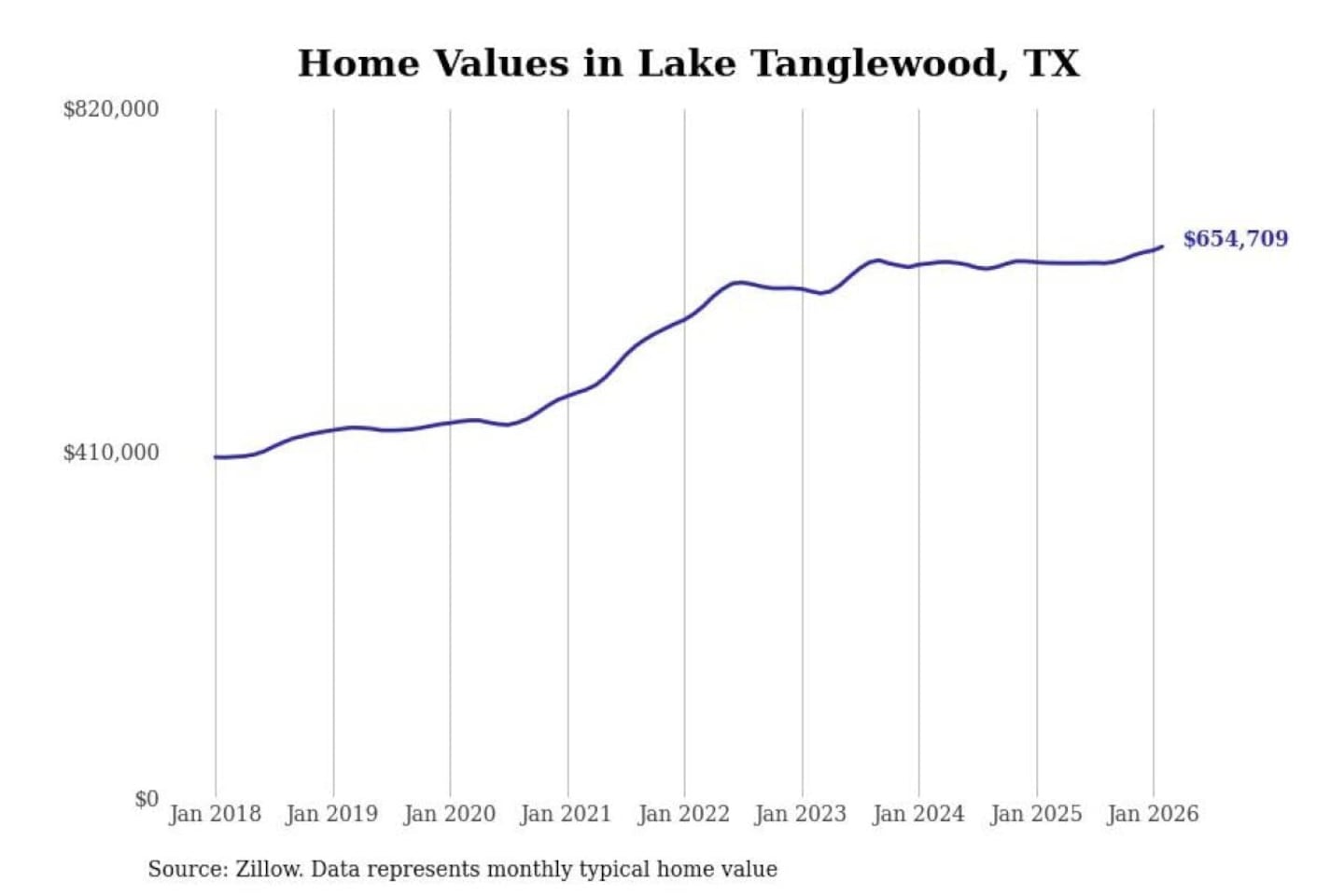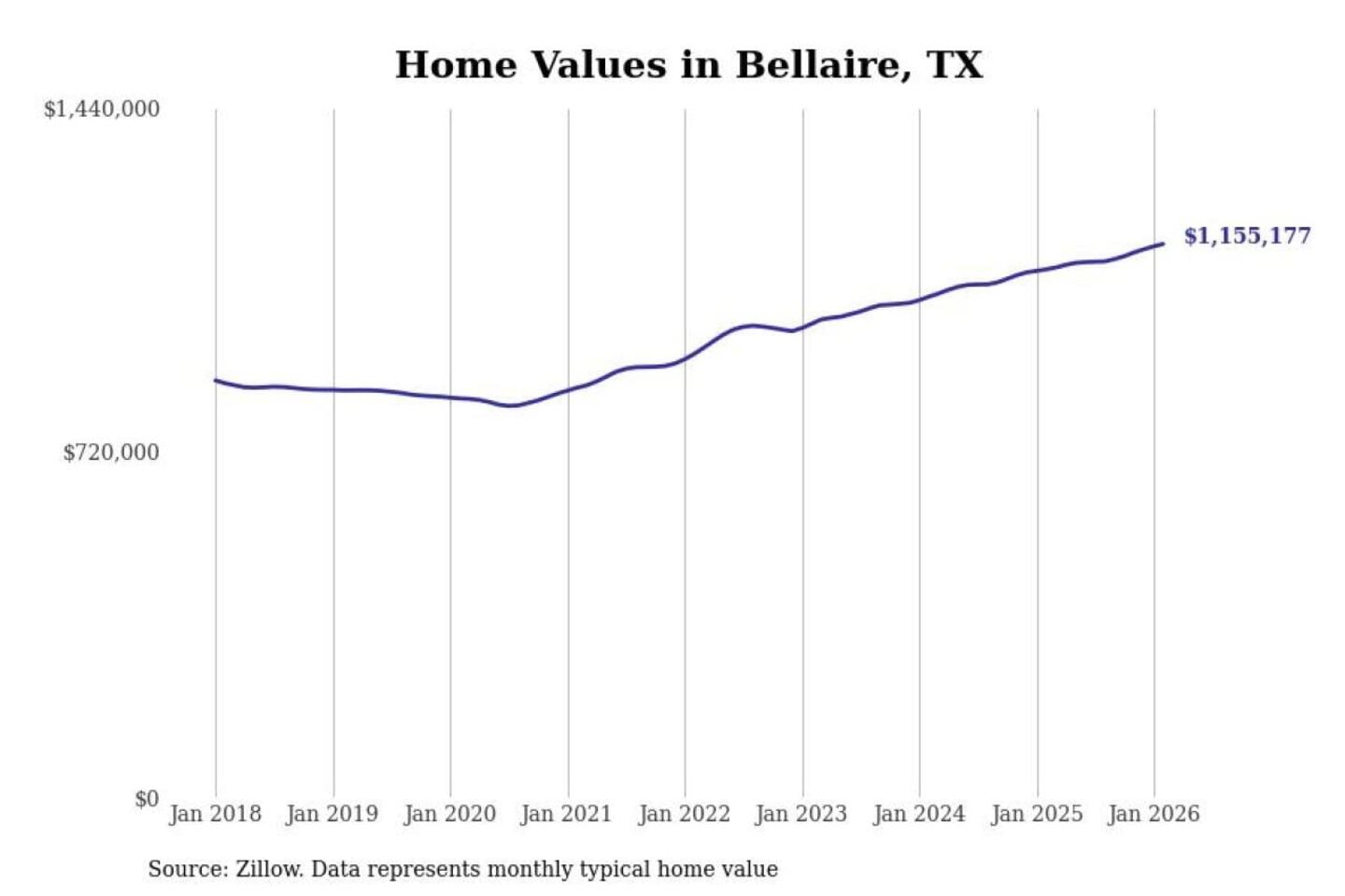 Stacker compiled a list of cities with the fastest-growing home prices in Texas using data from Zillow. Cities are ranked by the dollar change in the Zillow Home Values Index for all homes from the 12 months ending February 2026. The charts in this story were created automatically using Matplotlib. Data was available for 50 cities and towns in Texas.