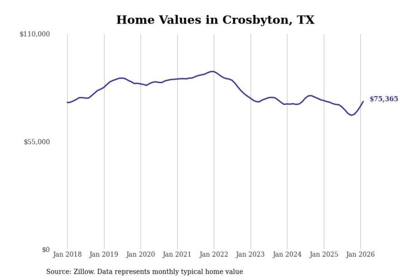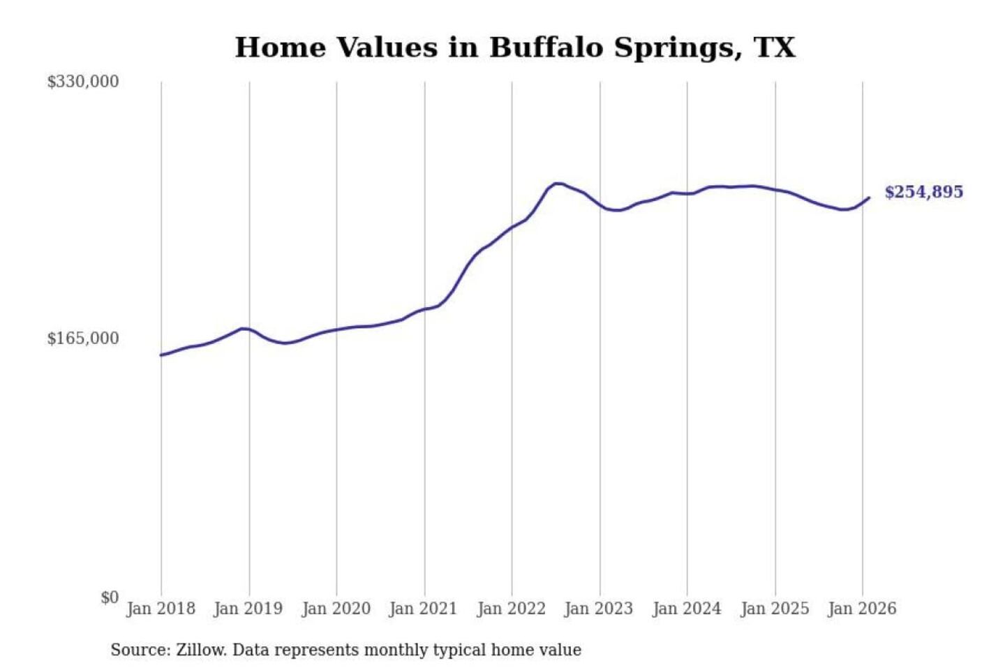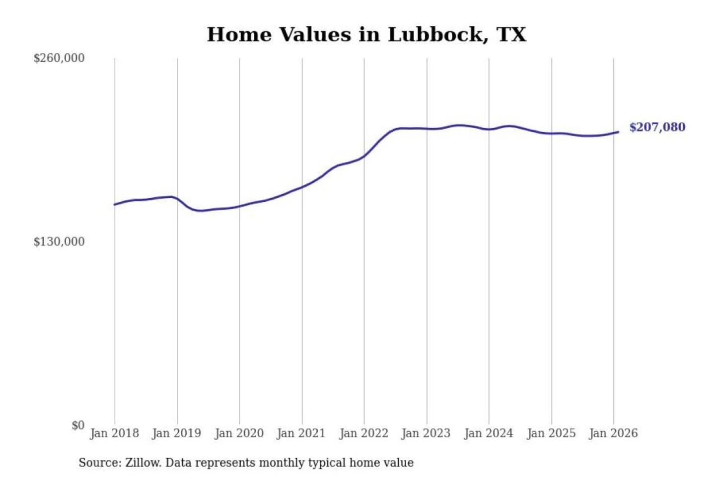 Stacker compiled a list of cities with the most expensive homes in the Lubbock, TX metro area using data from Zillow. Charts show the monthly typical home value since January 2018.