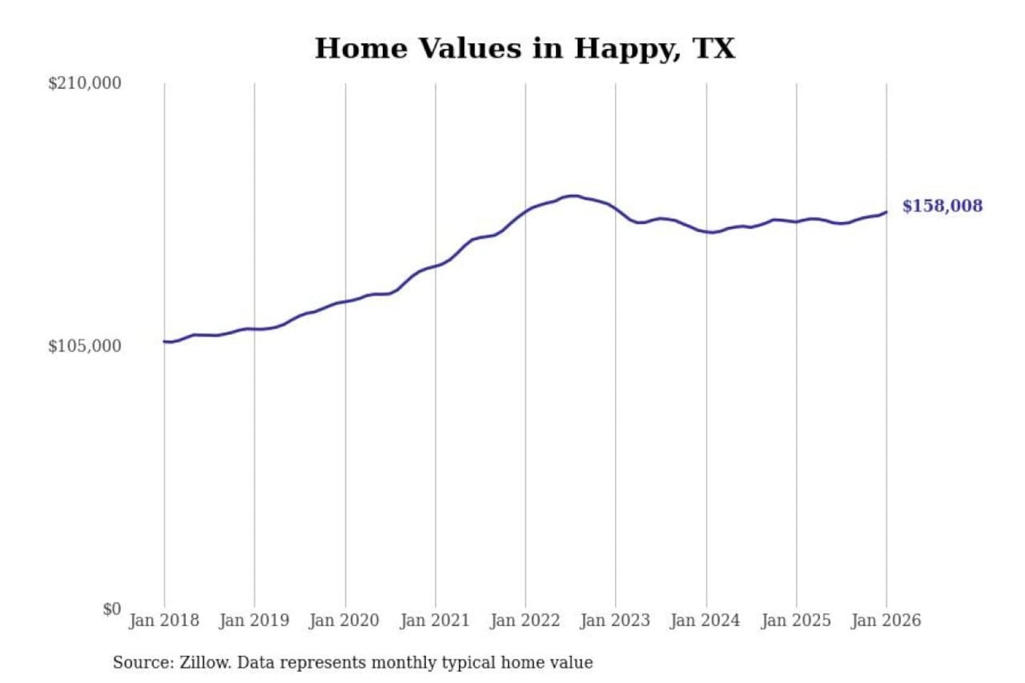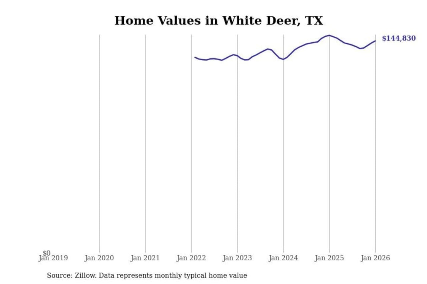 Stacker compiled a list of cities with the most expensive homes in the Amarillo, TX metro area using data from Zillow. Charts show the monthly typical home value since January 2018.