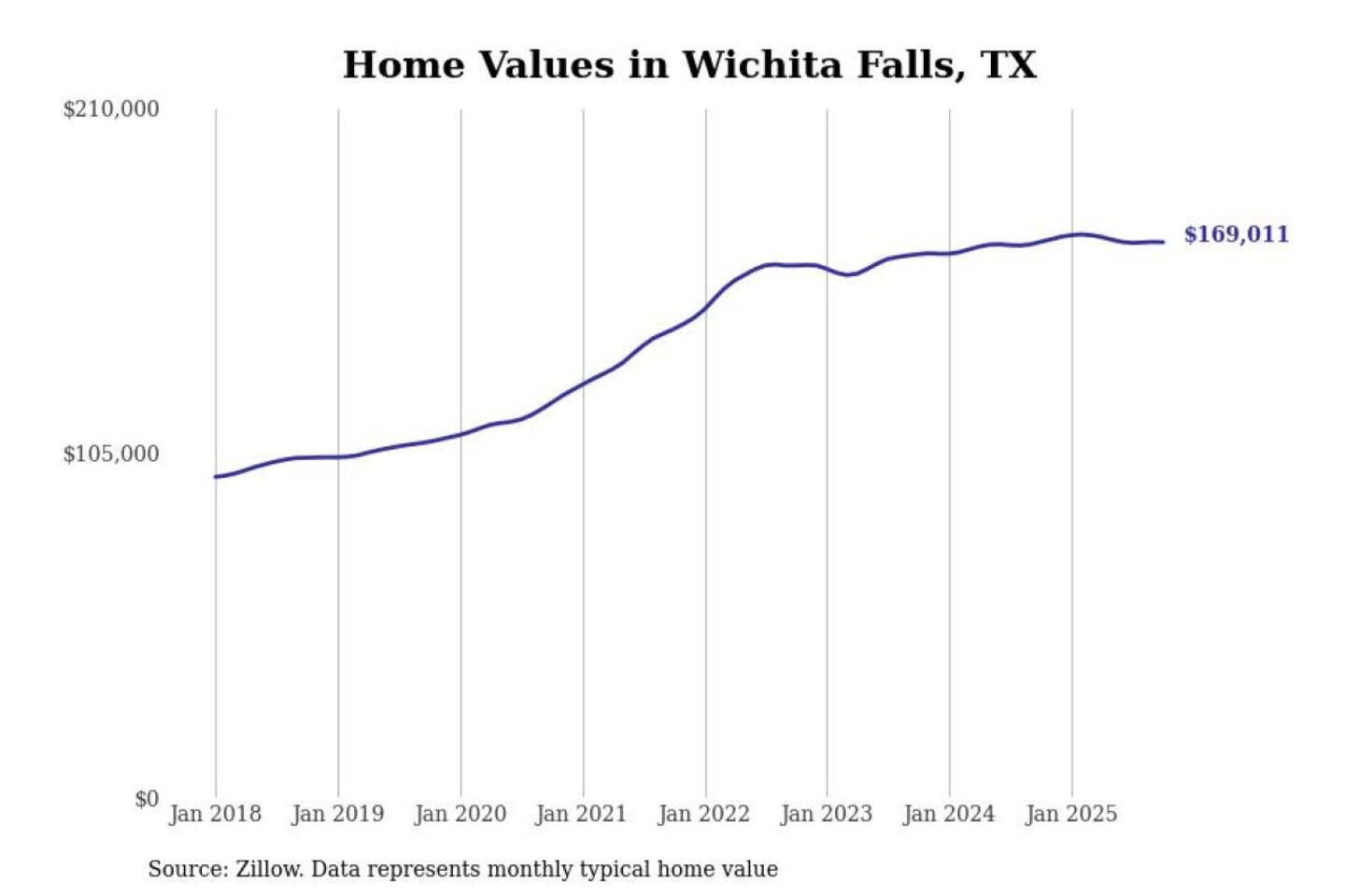 Stacker compiled a list of cities with the most expensive homes in the Wichita Falls metro area using data from Zillow. Charts show the monthly typical home value since January 2018. All 12 cities and towns with data available were included in the list.