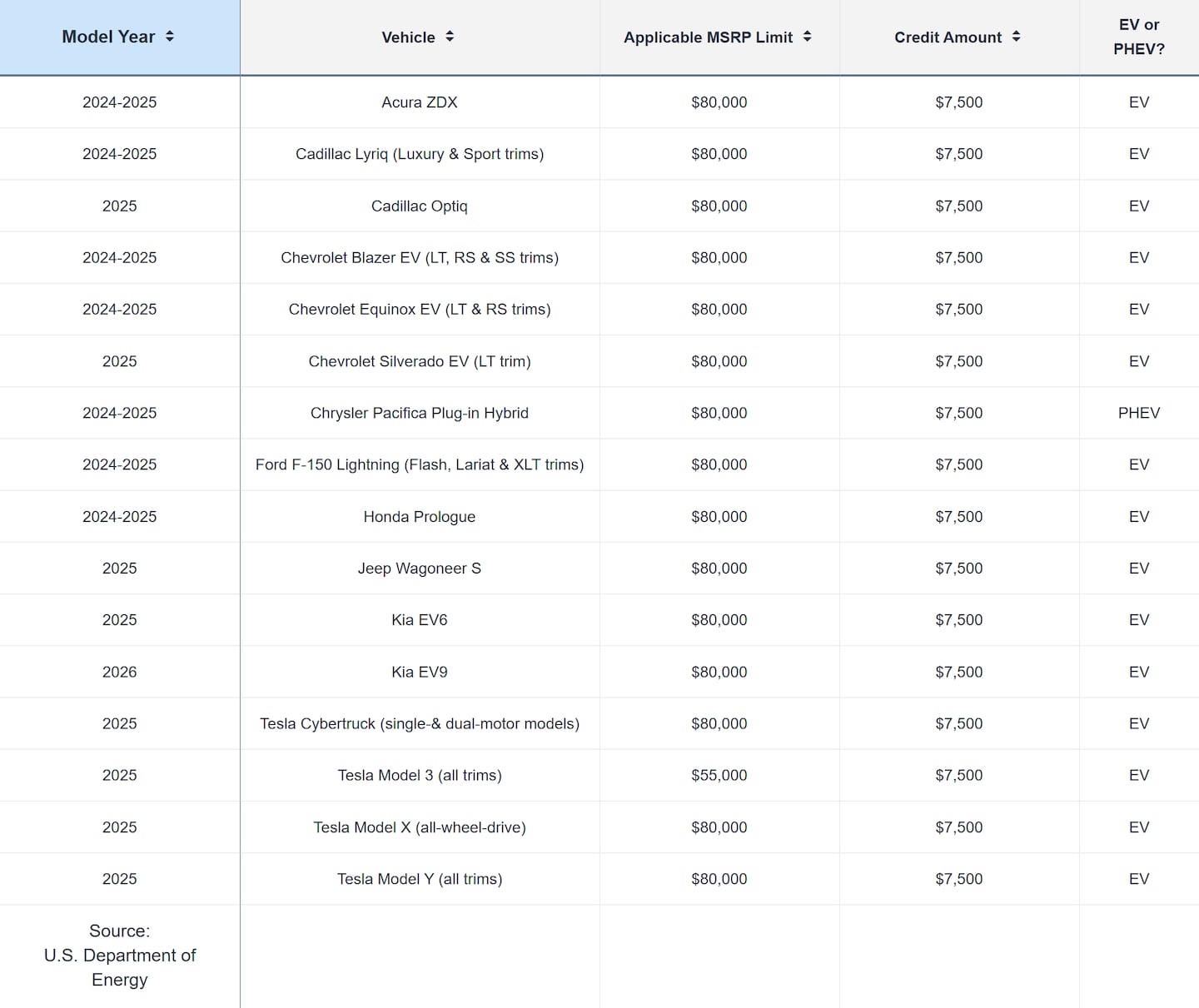 This list is based on data from the U.S. Department of Energy, last updated on January 14, 2025. It affects new cars placed in service from January 1 through December 31, 2025. The list will likely change to include more models in the coming months and years. Edmunds will strive to keep the list current as vehicle manufacturers continue to submit the applicable vehicle information to the relevant government agencies. For those who purchased a vehicle in 2024, the list of eligible vehicles is here.