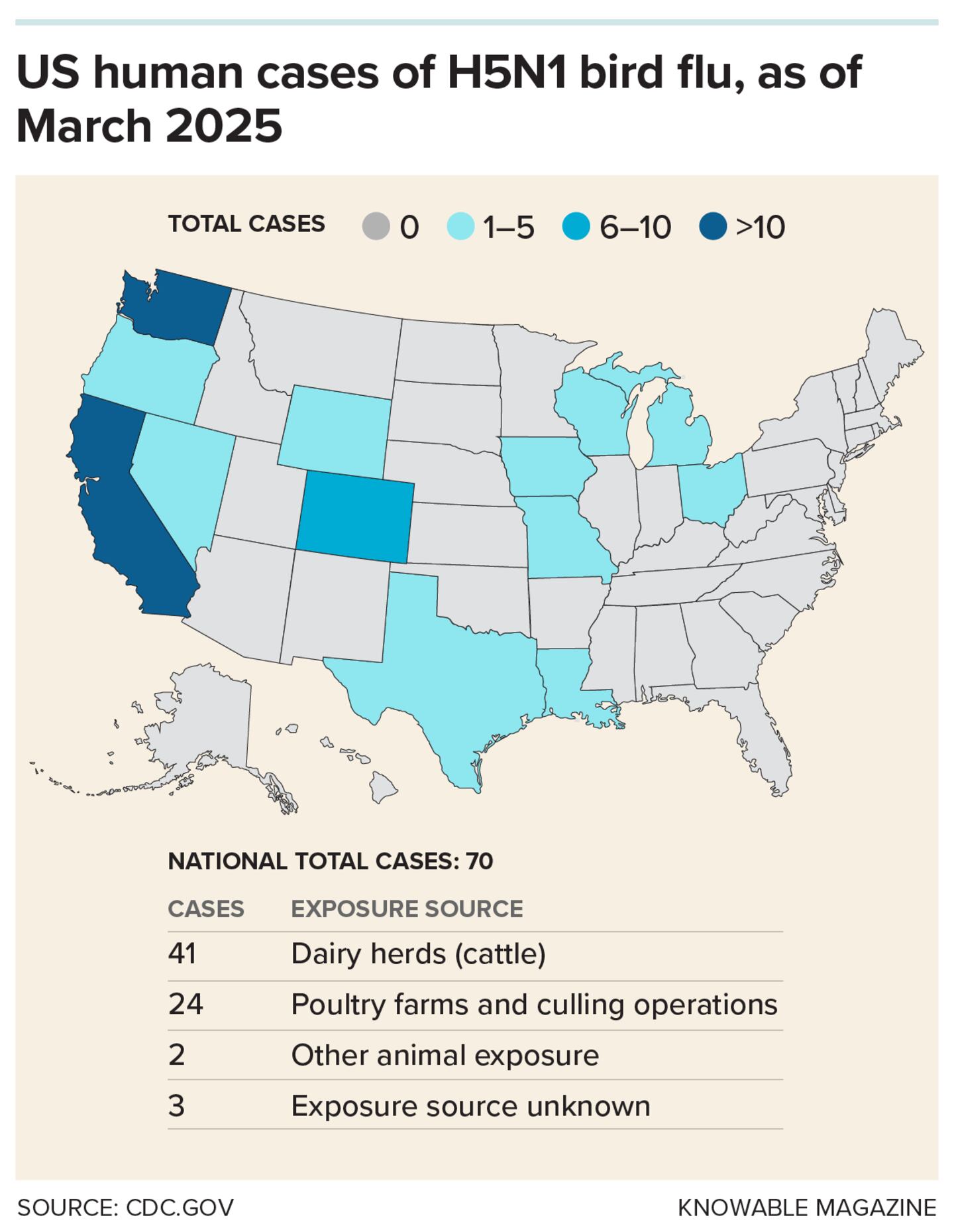 What kind of risk does all this pose for people? Gray has studied a number of viruses in cattle and other animals, and he says that while spillovers from one species to another are common, it's rare that a virus adapts to spread easily in the new species. As of spring 2025, there are no confirmed cases of human-to-human H5N1 transmission in the United States.