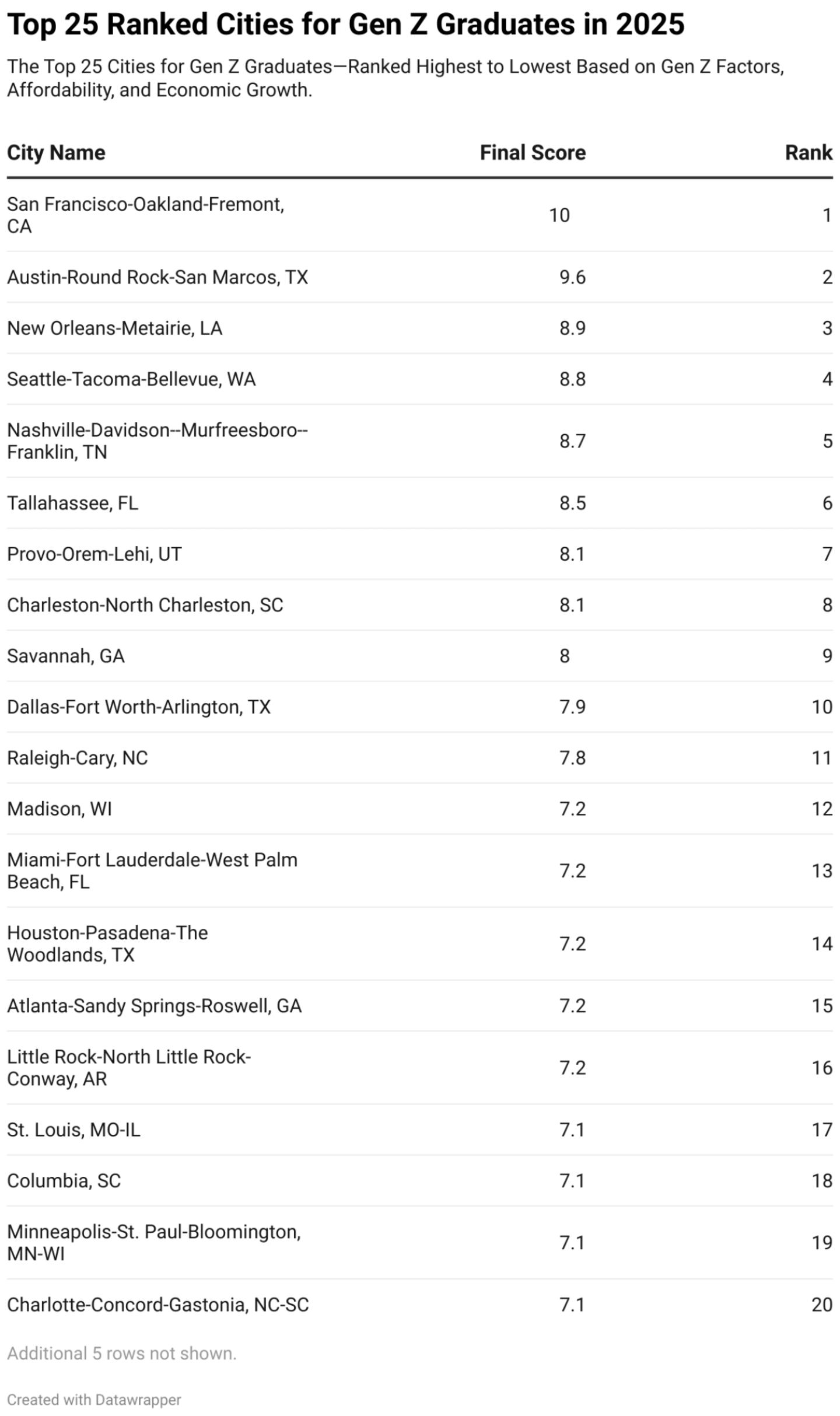 - The San Francisco metro (including Oakland and Fremont) is the new grad capital of 2025. With the top Gen Z factor score of any U.S. metro, the City by the Bay boasts the No. 4 walk score and comes in No. 3 for entertainment and No. 2 for diversity. And it's surprisingly not bad in affordability (ranking 13th) either.