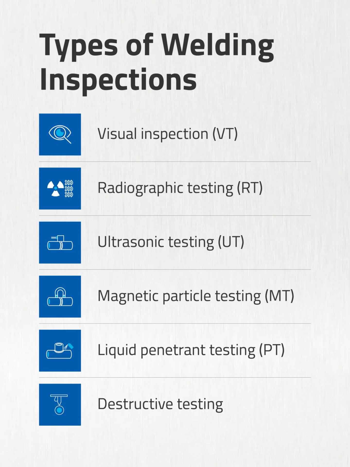- Dimensional inspection: Weld size, length, and placement are assessed to ensure they meet the drawing and code requirements.