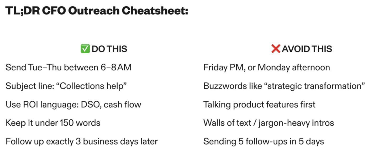 - Use clear subject lines like "Collections help" — something specific to a CFO's executive responsibilities.