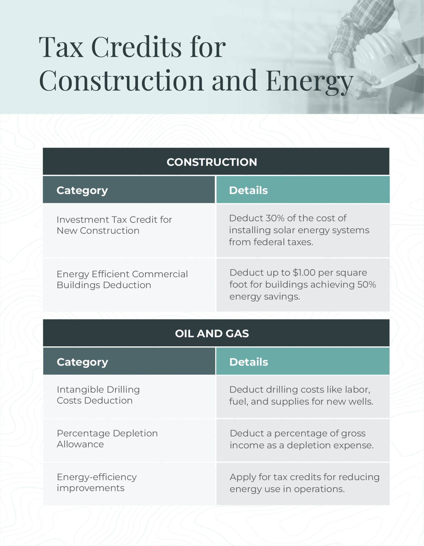 - Energy-efficiency improvements: Oil and gas companies that reduce energy use for operations can apply for energy efficiency tax credits.