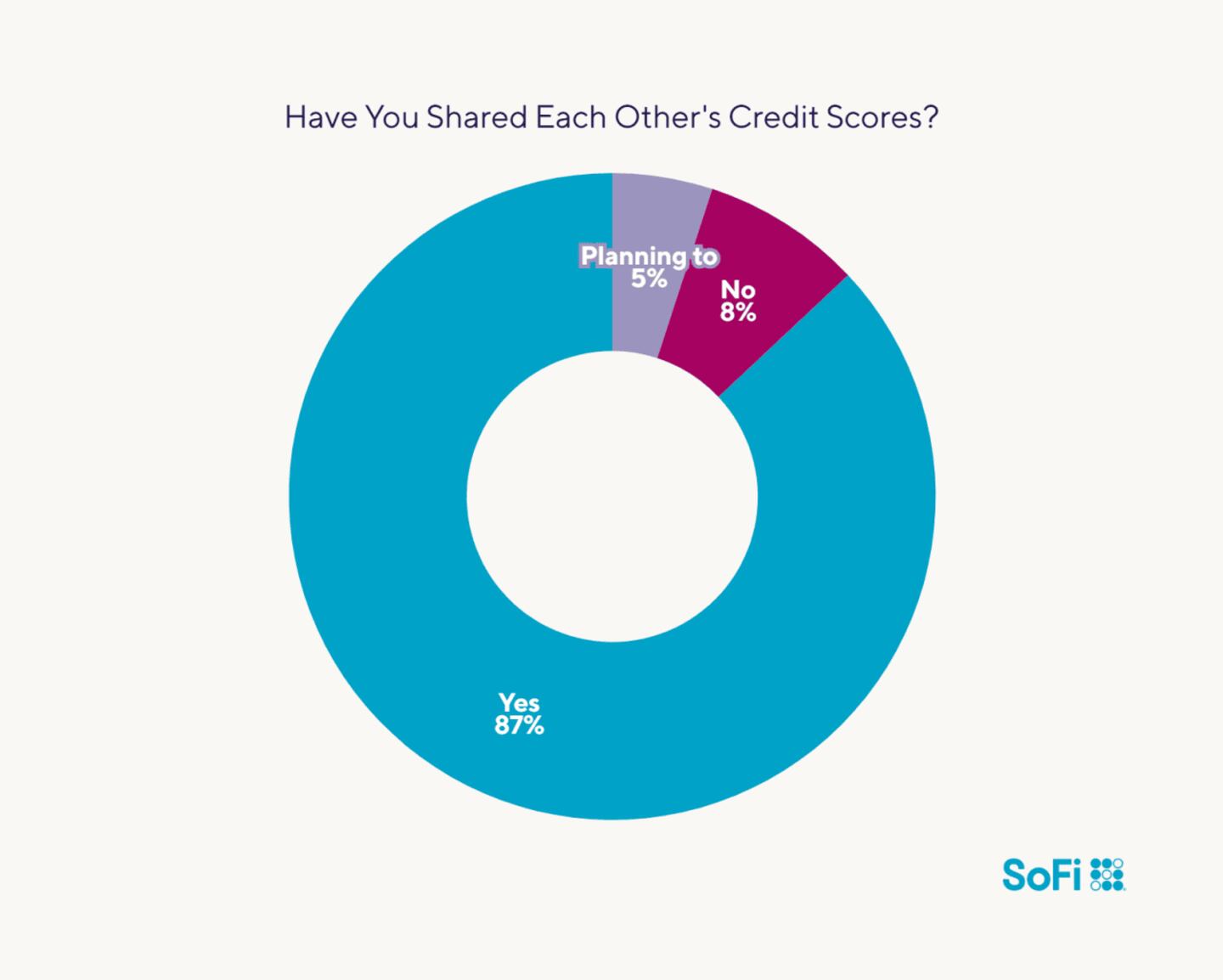 Even credit scores aren't off limits to SoFi survey respondents. Most (87%) said they've told their partner what their credit score is. Only 8% haven't shared this info, and 5% are planning to bring it up at some point. If you'd like to reveal your score to your partner, but you're not sure what it is, there are ways to check your credit score for free.