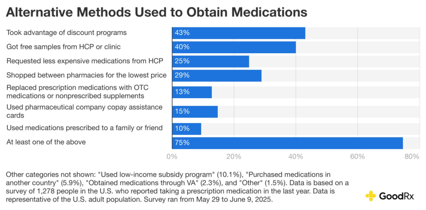 When prescriptions are too expensive, people may take steps to make sure they can get their medications. In 2025, 75% used at least one nontraditional resource, up from 70% in 2024.