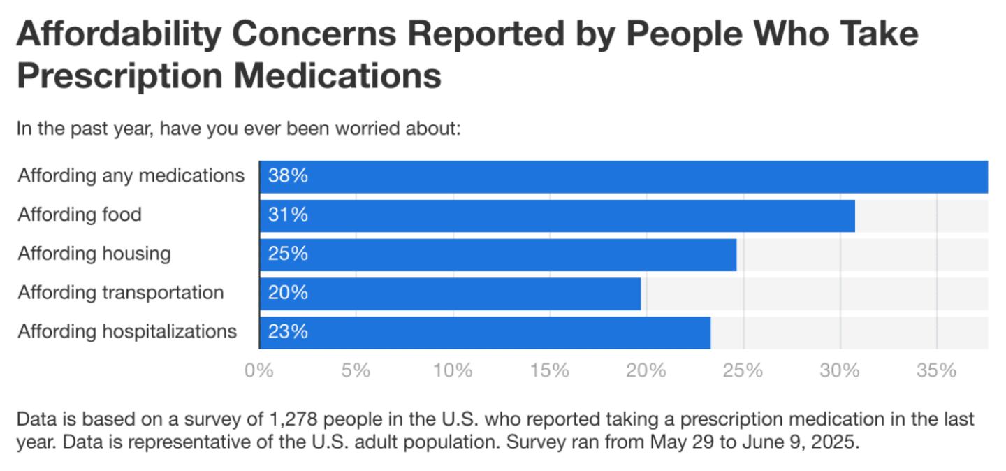 In 2025, 38% of people said they worried about being able to afford their medications, up significantly from 27% in 2024. More than half (57%) worried about affording at least one healthcare or essential cost in the past year.