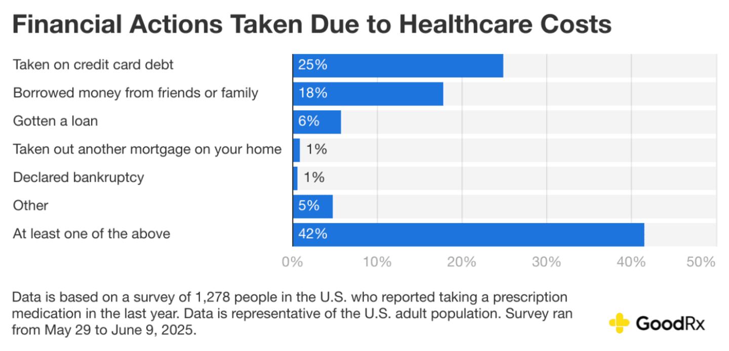 In addition to lifestyle changes, many Americans took on direct financial burdens to cover healthcare expenses. In 2025, 42% reported taking some kind of financial action due to healthcare costs, up from 39% in 2024. Here are some financial actions people took: