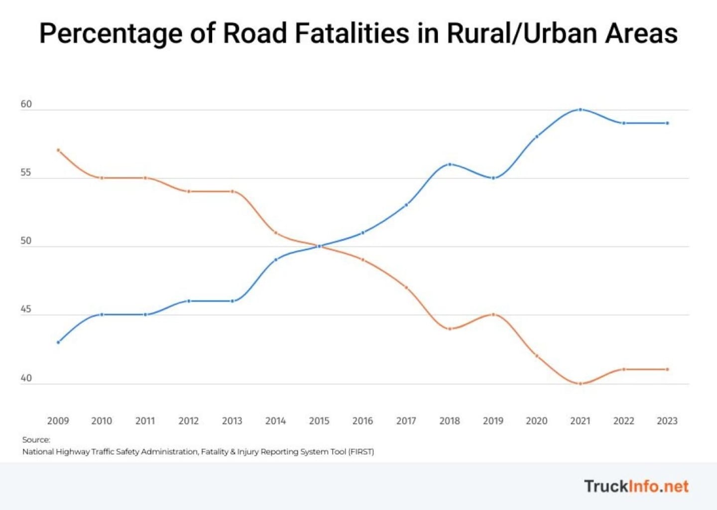 Up until 2015, rural roads were significantly more dangerous than urban roads. However, urban road fatalities overtook rural fatalities in 2016 and the gap has only widened.
