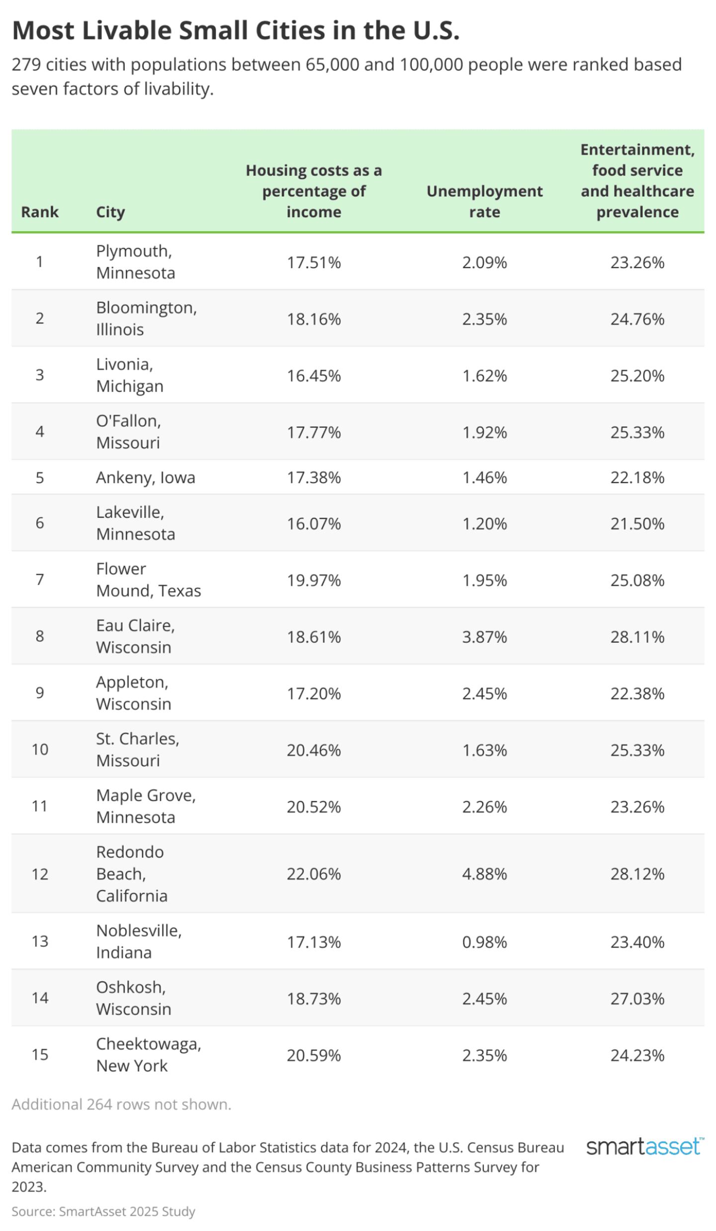 - Plymouth, MN is the most livable small city. Plymouth ranked among the top 10% of cities for multiple factors. With 98.7% of the population covered by health insurance, the wider community has the most peace of mind for medical care. The housing market is relatively affordable, with just 17.5% of the median $130,793 household income going to monthly payments. Poverty and unemployment were also among the lowest studywide, at 5.1% and 2.1%, respectively.