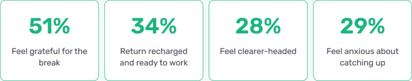 When employees do step back into work after time off, more than half (51%) say they feel grateful for the break, and a third (34%) return recharged and ready to work. Around one-quarter feel clearer-headed (28%) and motivated (26%), but for some, those positives are undercut by stress on the return. Nearly three in ten (29%) say they feel anxious about catching up, and about a quarter admit they struggle to get back into rhythm or felt immediately overwhelmed. A smaller group (10%) went so far as to say the stress of returning makes them question whether the time off was even worth it. This speaks to a cycle where rest is compromised on both ends: The difficulty of fully disconnecting, and the challenge of reintegration afterward. Instead of coming back renewed, employees often return to a wall of work that undermines the very purpose of taking time away.