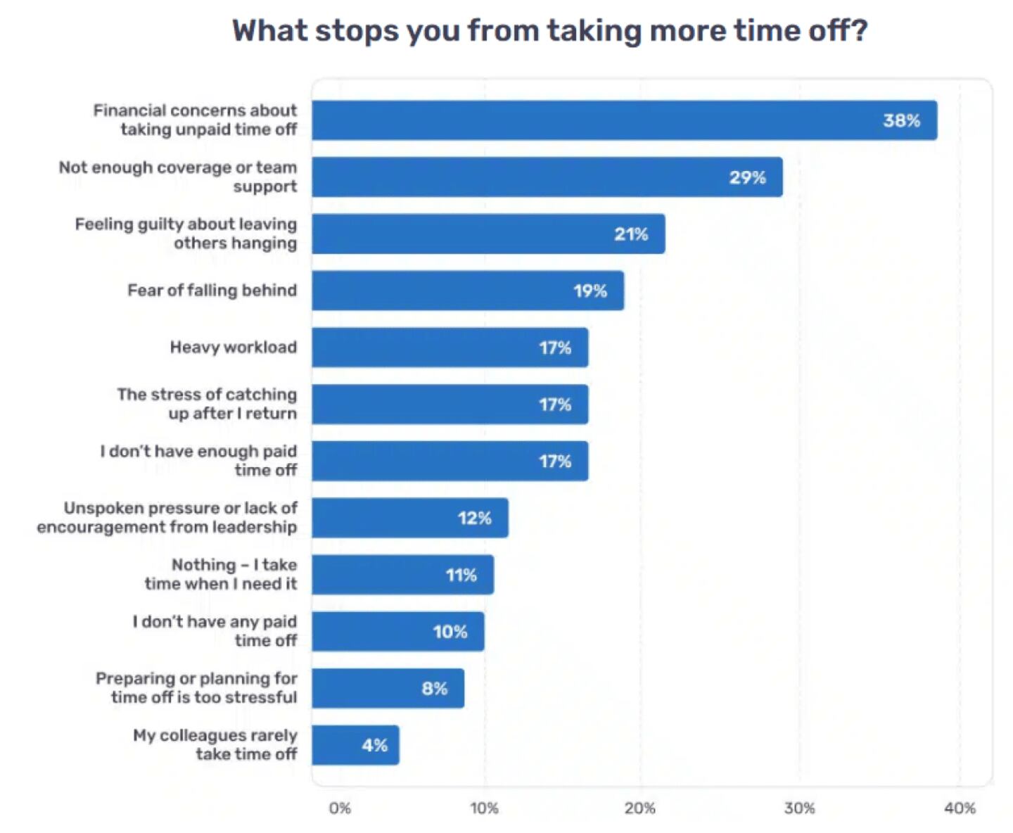 Beyond culture, employees point to concrete barriers that keep them from stepping away. The biggest is financial: Over a third worry about the cost of going unpaid, a concern that hits hardest for lower-wage workers and those relying on unpaid leave. But money isn’t the only obstacle. Nearly a third cite lack of coverage or team support, one in five admit they feel guilty about burdening coworkers, and others point to the stress of heavy workloads, catching up afterward, or falling behind.