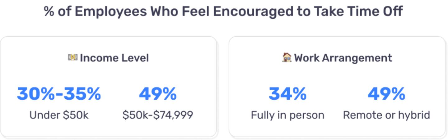 This encouragement gap isn’t evenly felt. Higher-income employees are far more likely to feel supported in stepping away (49% of those who make $50k–$74,999), while only 30–35% of those earning under $50k say the same. Work arrangement plays a role, too: Nearly half of remote or hybrid employees (49%) feel encouraged, compared to just 34% of those working fully in person.