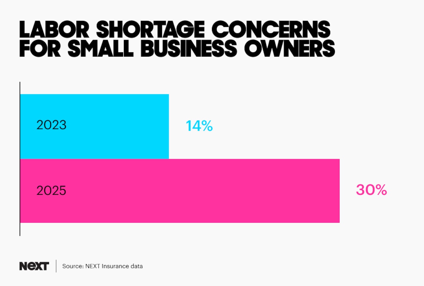 While a labor shortage is low on the list of stressors for small business owners, it's one of the fastest-growing sources of stress—more than doubling from 14% in 2023 to 30% in 2025.