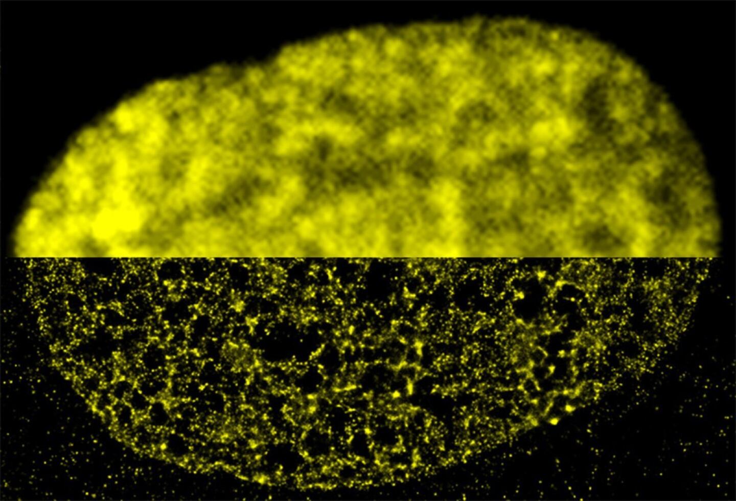 Super-resolution microscopy uses a variety of techniques to detect detail that would normally be hidden by the diffraction limit, Schermelleh explains. Single-molecule localization microscopy, for instance, takes advantage of the fact that spots on an image are easier to localize with precision when they appear in isolation rather than clustered together. Scientists label the molecules of interest with fluorescent tags designed to spontaneously emit light. As the probes twinkle on and off, computational models estimate exactly where each molecule is located — and reconstruct a high-resolution image of the sample.
