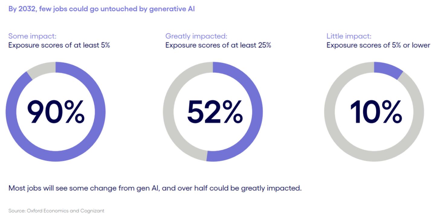 While there's a lot of focus on entry-level jobs, most jobs will feel the impact of AI—everyone from administrative assistants to CEOs will be affected. Cognizant and Oxford Economics research found generative AI could disrupt most jobs (90%) in some way over the next 10 years.