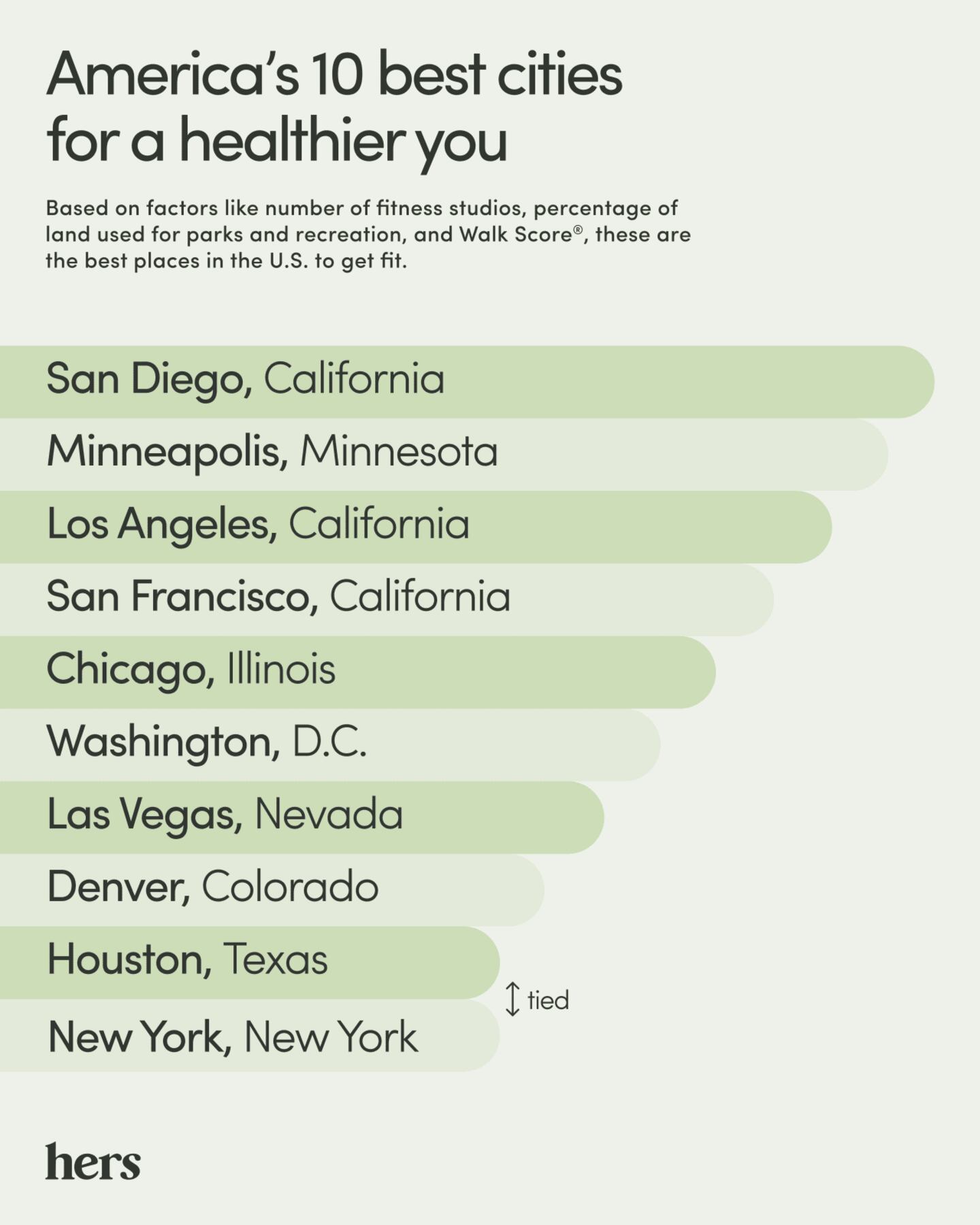 Hers ranked the best U.S. destinations for a healthier you based on the country’s 50 most populous metropolitan statistical areas. Each city was ranked based on five data points:
