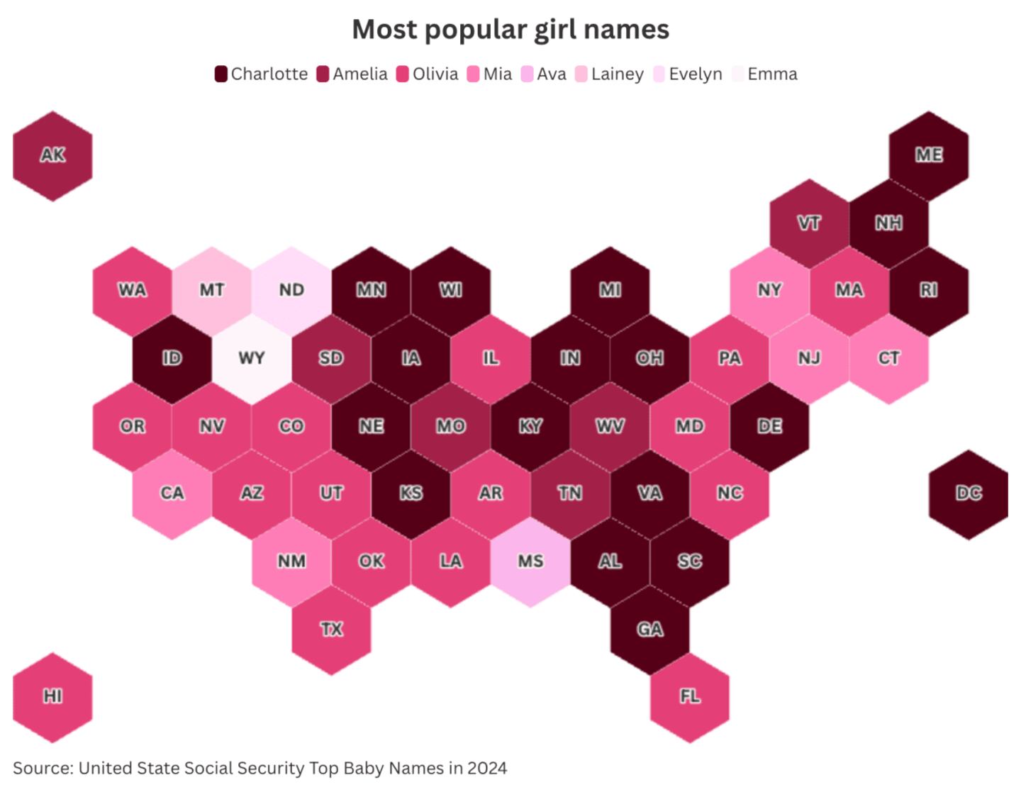 As displayed in the infographic above, various regions across the United States have higher prevalences of certain names. In the Pacific Northwest region, for example, Oliver was the most common name for 2024. Across the mid-Atlantic, Liam took the first spot.