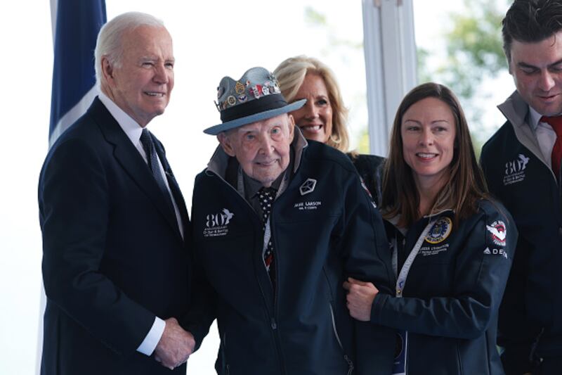 D-Day 80th Anniversary COLLEVILLE-SUR-MER, FRANCE - JUNE 06: U.S. President Joe Biden greets American World War II veteran Jake Larson, before a ceremony marking the 80th anniversary of D-Day at the Normandy American Cemetery on June 06, 2024 in Colleville-sur-Mer, France. Veterans, families, political leaders and military personnel are gathering in Normandy to commemorate D-Day, which paved the way for the Allied victory over Germany in World War II. (Photo by Win McNamee/Getty Images) (Win McNamee/Getty Images)