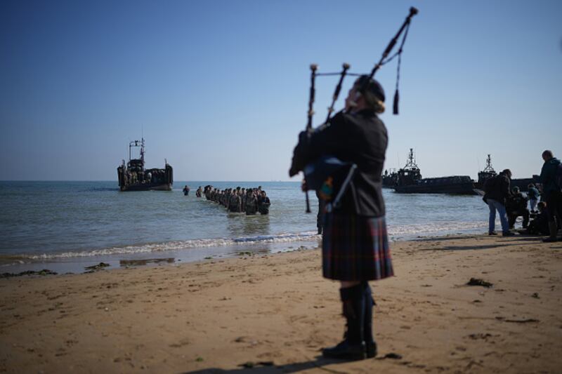 D-Day 80th Anniversary ASNELLES, FRANCE - JUNE 06: Royal Marines of 47 Commando land on Gold Beach to mark the 80th anniversary of the D-Day landing on June 06, 2024 in Asnelles, France. June 6th is the 80th anniversary of the D-Day landings which saw 156,000 troops from the allied countries including the United Kingdom and the United States join forces to launch an audacious attack on the beaches of Normandy, these assaults are credited with the eventual defeat of Nazi Germany. (Photo by Christopher Furlong/Getty Images) (Christopher Furlong/Getty Images)