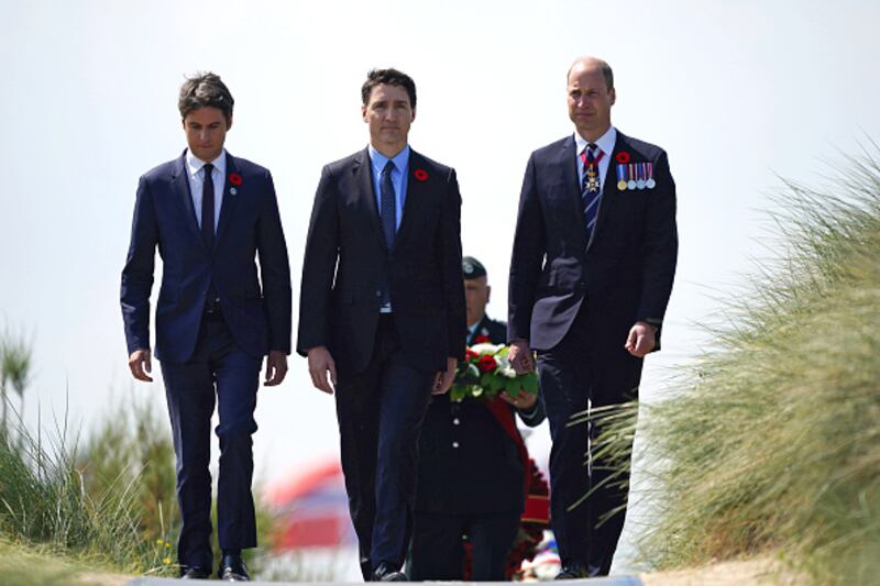 D-Day 80th Anniversary COURSEULLES-SUR-MER, FRANCE - JUNE 6: Prince William, Prince of Wales, Canadian Prime Minister Justin Trudeau, and Prime Minister of France Gabriel Attal attend the Government of Canada ceremony to mark the 80th anniversary of D-Day, at Juno Beach on June 6, 2024 in Courseulles-sur-Mer, France. Normandy is hosting a variety of events across significant sites such as Pegasus Bridge, Sainte-Mère-Église, and Pointe du Hoc, leading up to the official commemoration of the 80th anniversary of the D-Day landing on June 6. (Photo by Jordan Pettitt - Pool/Getty Images) (Pool/Getty Images)