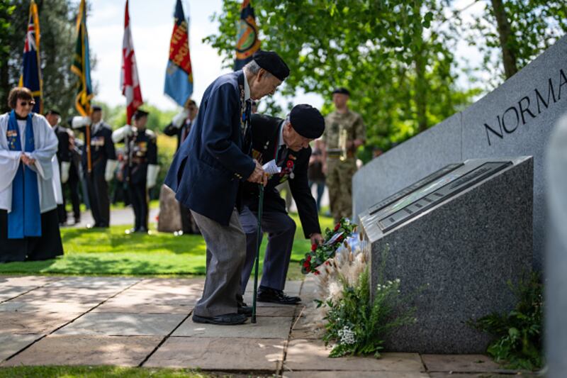 D-Day 80th Anniversary ALREWAS, ENGLAND - JUNE 6: 99-year-old Normandy veteran Simeon Mayou (L) is helped to lay a wreath during a service commemorating Normandy veterans at the Normandy Memorial at The National Arboretum on June 6, 2024 in Alrewas, England. On June 6th, 1944, 156,000 Allied troops landed on the five Normandy beaches in northern France by air and sea. Operation Overlord was the start of Allied operations which went on to liberate Western Europe, defeat Nazi Germany and end the Second World War. The events of that day are known as D-Day. (Photo by Carl Court/Getty Images) (Carl Court/Getty Images)
