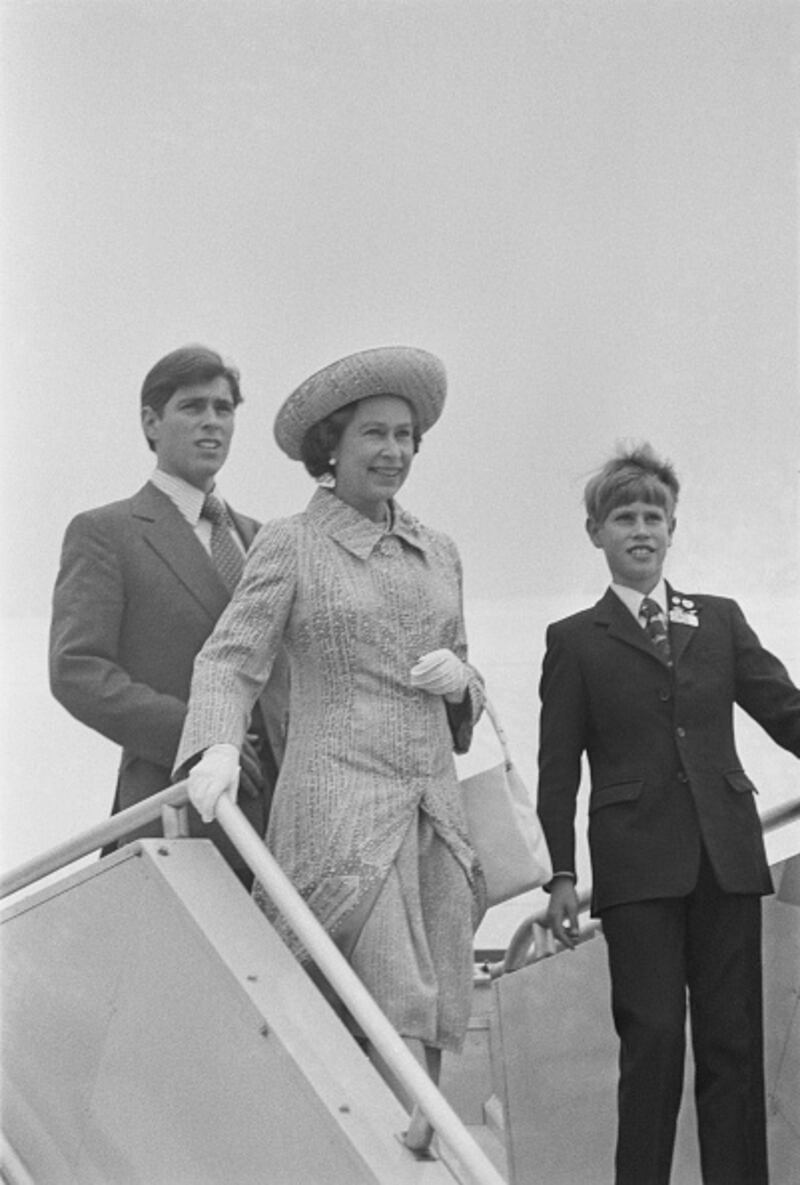 Through the years Queen Elizabeth II disembarking a plane with her sons, Prince Edward and Prince Andrew, UK, 26th July 1976. (Photo by Jones/Evening Standard/Hulton Archive/Getty Images) (Evening Standard/Getty Images)