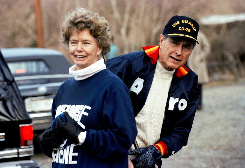 Nancy Bush Ellis FILE PHOTO: This Jan. 7, 1990, file photo shows President George H. W. Bush hiding behind his sister, Nancy Ellis, as he prepares for a jog along the C&O canal in the Georgetown section of Washington. A longtime Democrat who helped her Republican brother and nephew get elected president, died of complications of the coronavirus Sunday, Jan. 10, 2021, at an assisted living facility in Concord, Massachusetts. She was 94. (Marcy Nighswander/AP)