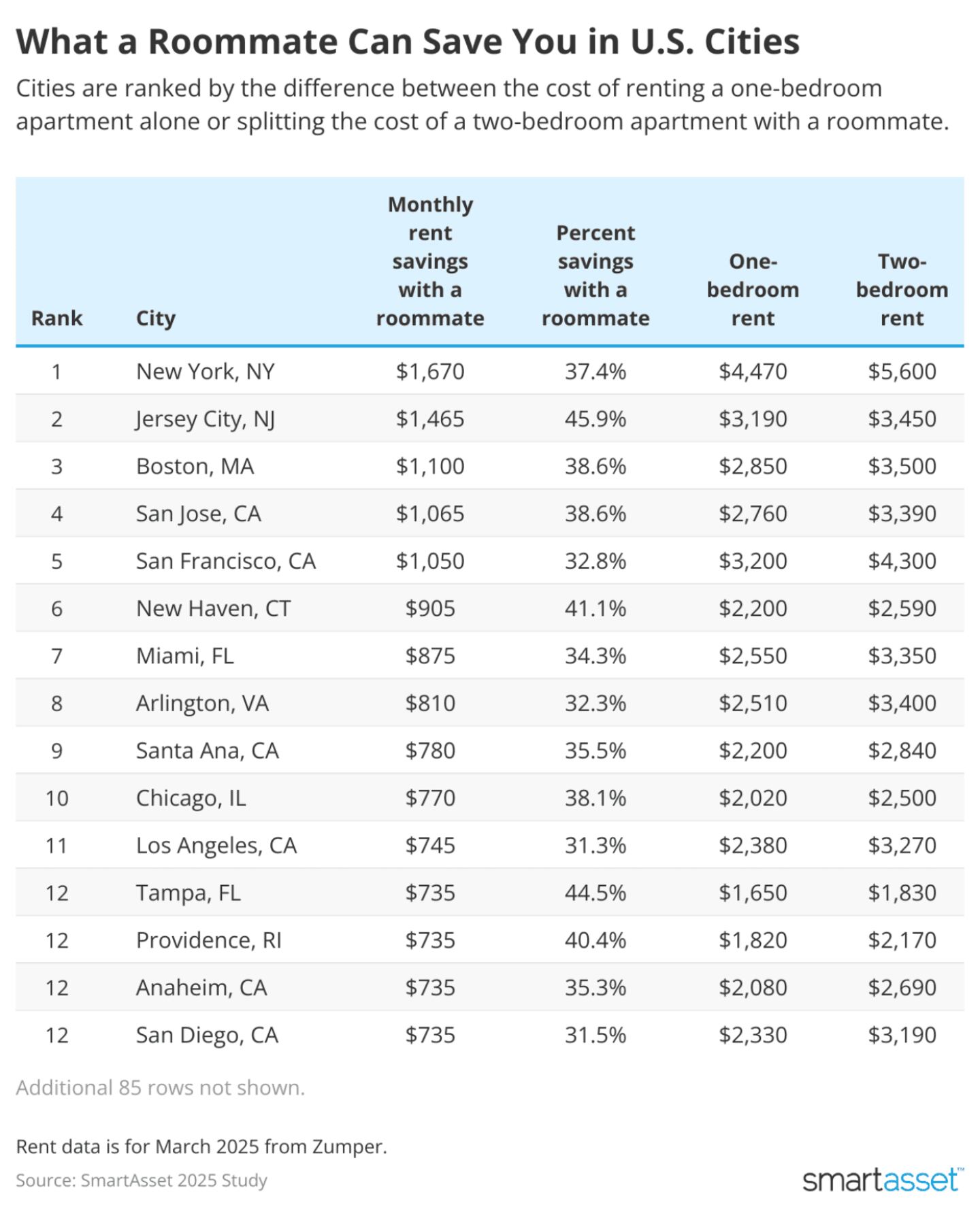 This SmartAsset study examined data from 100 U.S. cities, comparing the average rents for one-bedroom and two-bedroom apartments between March 2024 and March 2025 based on data from Zumper. Specifically, the cost of a one-bedroom was compared with half the cost of a two-bedroom for each city, assuming each roommate pays equal rent.