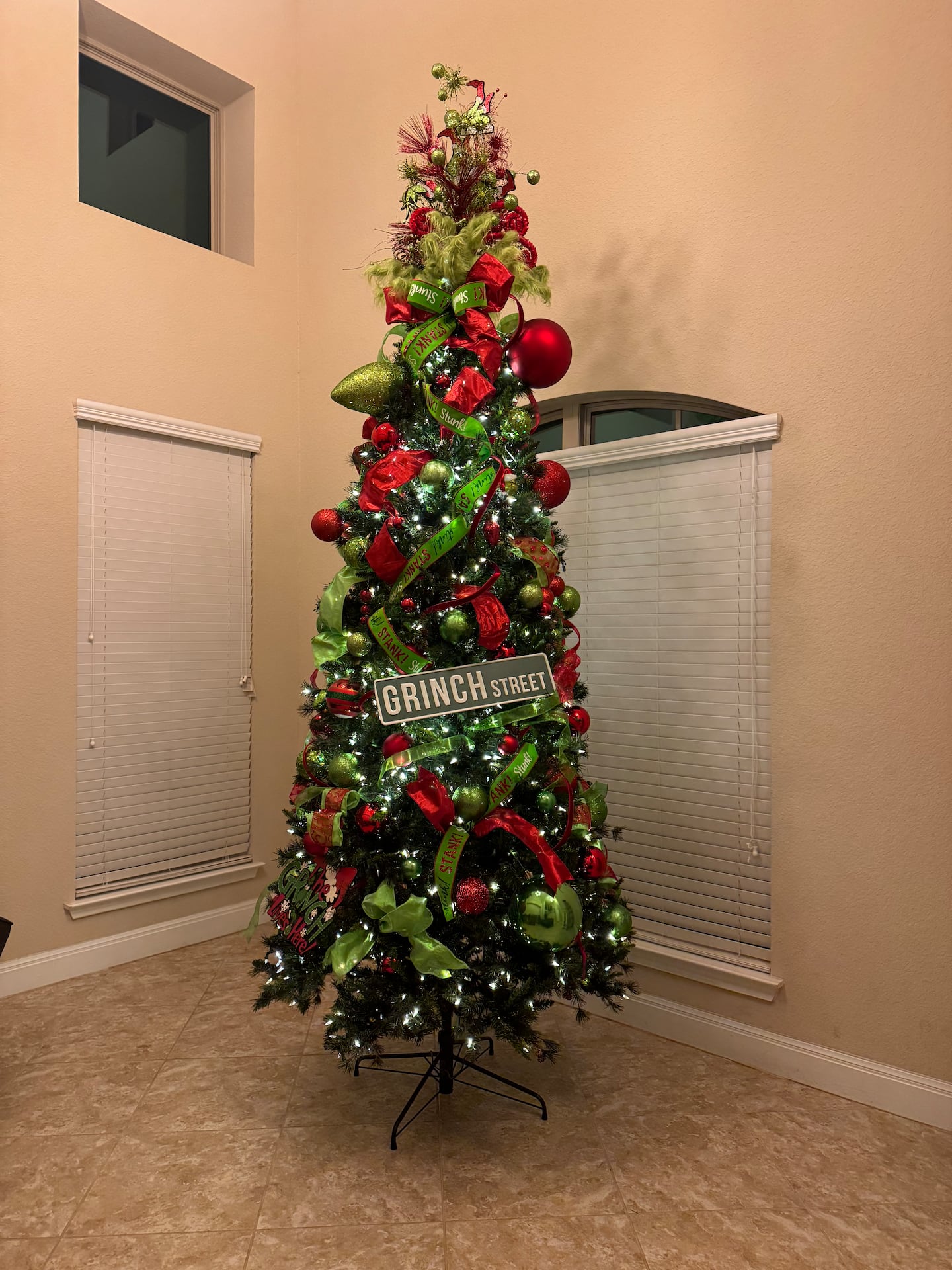 Do you see it? It seriously is like a Grinch themed hat on top of the tree. Eventually I was able to make it look right and finished the decorating...at 2am! This tree literally serves no purpose but to sit in the front room and be seen through the window. We don’t put gifts under it, we don’t do anything in that front room, as a matter of fact there are days that the lights get forgotten about and don’t get turned on. Am I going to get rid of it? No. I have been told by my husband that I have to get new decorations next year. I don’t think he knows how much that is going to cost since I’ve slowly added to this collection over the years but here is the final product.