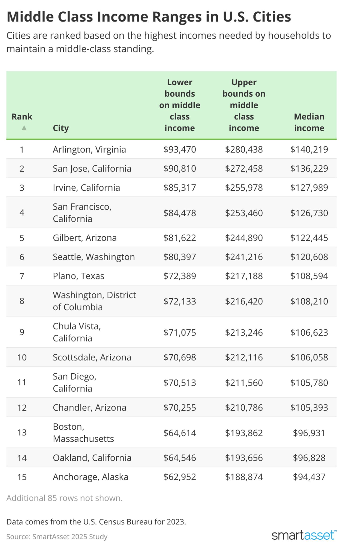 - You could be earning $280,000 and still be middle class in this city. Arlington, Virginia, sets the highest bar to be in the middle class with a threshold of $93,470 to $280,438. And in California, San Jose ($90,810 to $272,458); Irvine ($85,317 to $255,978); and San Francisco ($84,478 to $253,460) also demand hefty earnings to stay in the middle.